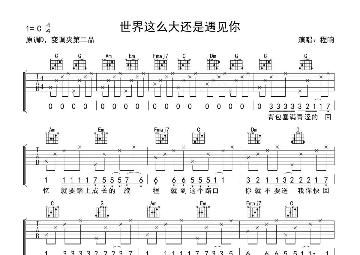 程响《世界这么大还是遇见你》吉他谱 - C调弹唱六线谱