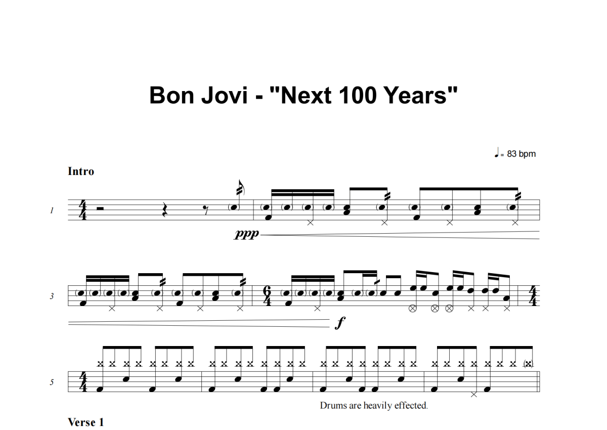 《Next 100 Years》是Bon Jovi演唱的一首歌曲,这份架子鼓谱共有六张高清图谱,图谱由 @举个例子 编配上传,图谱使用五线谱编配,使用这份Next 100 Years架子鼓谱,你将能够轻松地敲打出这首Bon Jovi的Next 100 Years,快来尝试吧。
