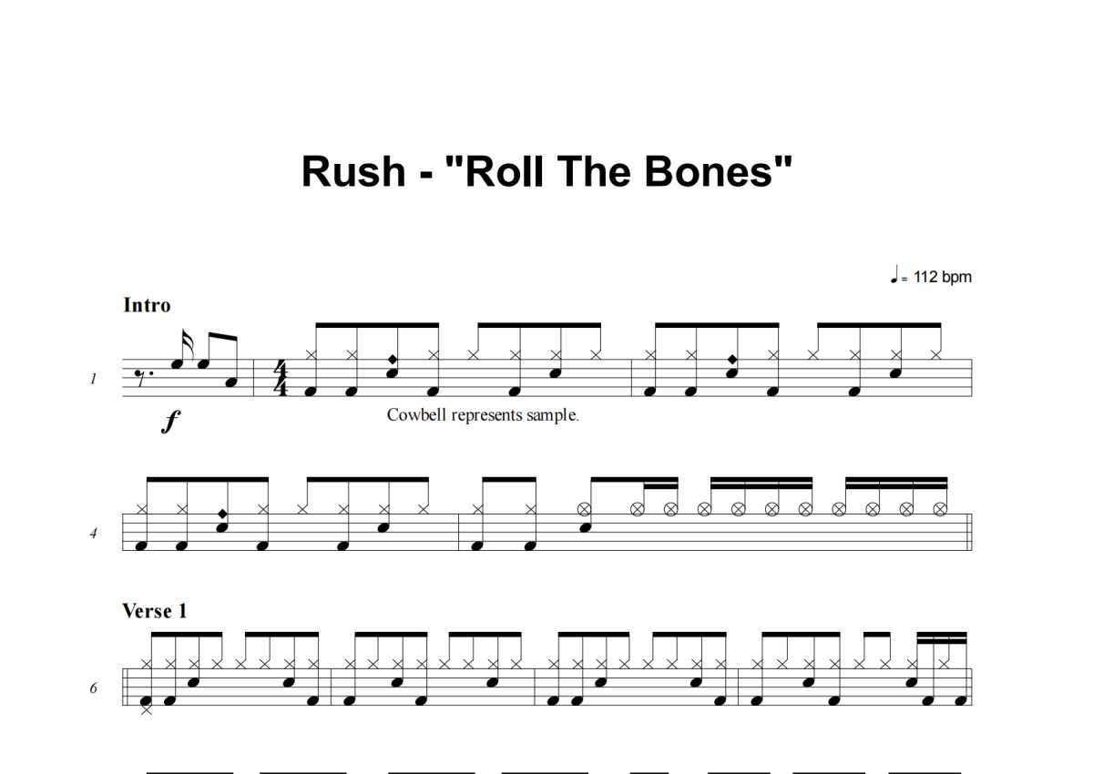 《Roll The Bones》是Rush演唱的一首歌曲,这份架子鼓谱共有六张高清图谱,图谱由 @举个例子 编配上传,图谱使用五线谱编配,使用这份Roll The Bones架子鼓谱,你将能够轻松地敲打出这首Rush的Roll The Bones,快来尝试吧。