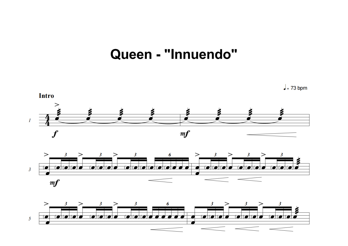 《Innuendo》是Queen演唱的一首歌曲,这份架子鼓谱共有六张高清图谱,图谱由 @举个例子 编配上传,图谱使用五线谱编配,使用这份Innuendo架子鼓谱,你将能够轻松地敲打出这首Queen的Innuendo,快来尝试吧。