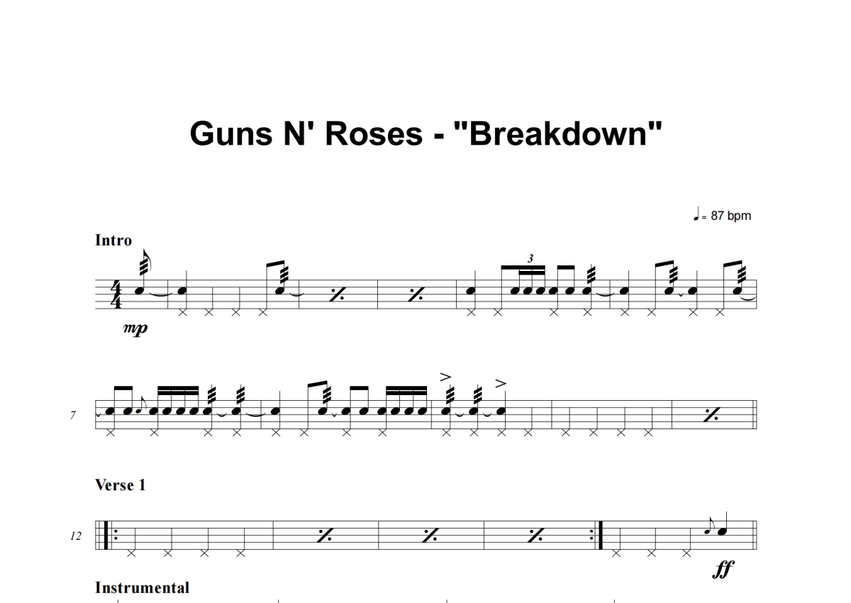 《Breakdown》是Guns N' Roses演唱的一首歌曲,这份架子鼓谱共有五张高清图谱,图谱由 @举个例子 编配上传,图谱使用五线谱编配,使用这份Breakdown架子鼓谱,你将能够轻松地敲打出这首Guns N' Roses的Breakdown,快来尝试吧。