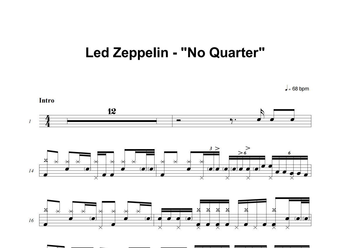 《No Quarter》是Led Zeppelin演唱的一首歌曲,这份架子鼓谱共有五张高清图谱,图谱由 @举个例子 编配上传,图谱使用五线谱编配,使用这份No Quarter架子鼓谱,你将能够轻松地敲打出这首Led Zeppelin的No Quarter,快来尝试吧。